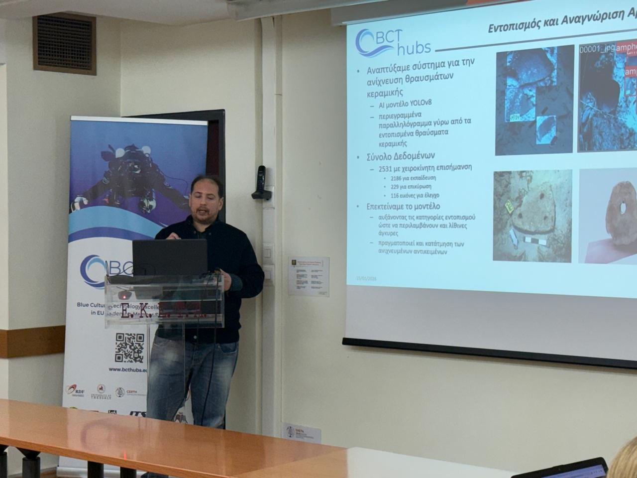 Το εργαστήριο πραγματοποιήθηκε στις 15 Ιανουαρίου 2026 στην αίθουσα «Ζέφυρος» του ΕΚΕΤΑ στη Θεσσαλονίκη, με υβριδική μορφή. Στο εργαστήριο συμμετείχαν ερευνητές, επαγγελματίες και ενδιαφερόμενους φορείς που δραστηριοποιούνται στον τομέα. Κατά τη διάρκειά του παρουσιάστηκαν οι καινοτόμες τεχνολογικές λύσεις και μεθοδολογίες του έργου BCThubs, εργαλεία για την παρακολούθηση της Ενάλιας Πολιτιστικής και Φυσικής Κληρονομιάς, , ημιαυτόνομα RoV για την υποστήριξη της ενάλιας αρχαιολογικής έρευνας, πληθοποριστική πλατφόρμα για δημιουργία 3D ανακατασκευή του υποθαλάσσιου περιβάλλοντος κ.α. Παρουσιάστηκαν, επίσης, οι στρατηγικοί πυλώνες του έργου BCThubs, οι Καλές Πρακτικές των τελευταίων ετών στην προστασία και ανάδειξη της Ενάλιας Πολιτισμικής Κληρονομιάς με τη χρήση καινοτόμων τεχνολογιών, καθώς και οι προσεγγίσεις των έργων ecoRoute & TOURAL για την ανάπτυξη του βιώσιμου τουρισμού.